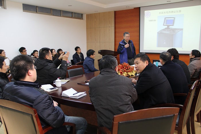 会上,阎培渝教授和王强教授与我校教师生深入交流了有关低碳水泥、墙体材料、脱硫脱硝方面的研究体会,并就人才队伍建设与管理进行了广泛与深入的讨论。会后,两位教授参观了我室各项研发平台,对我室取得的科研成果表示充分的肯定。